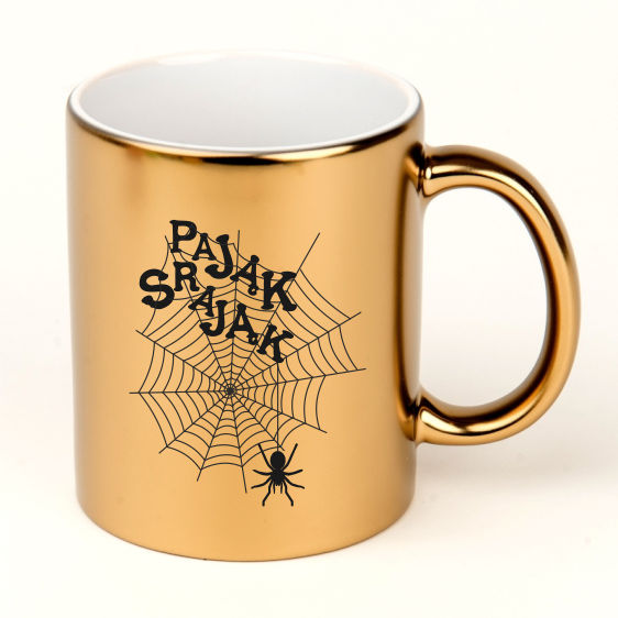 Ekscentryczny kubek w złotym kolorze z nadrukiem pająka i pajęczyny, na którym możemy umieścić dowolną dedykację.