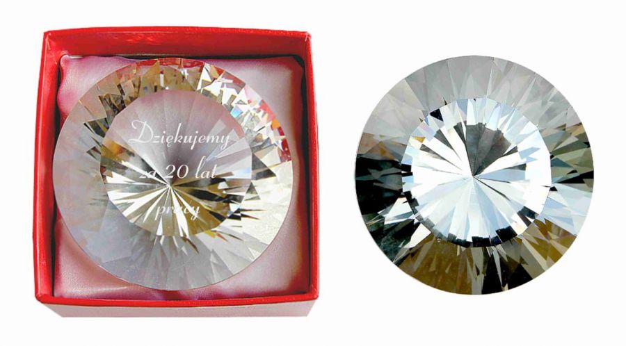 Duży diament kryształowy to niesamowicie wyglądający przedmiot, imitujący prawdziwy diament jubilerski, wykonywany przy pomocy szlifu diamentowego. Prześlicznie i bogato prezentuje się na szklanych półkach lub też w okolicy okna, skąd padające światło budzi w nim ogień i feerię barw, oświetlających całe pomieszczenie. Idealnie nadaje się jako prezent dla każdego i przy każdej okazji – dla Mamy na urodziny, ukochanej osoby na Walentynki, Szefa z okazji jubileuszu firmy, pracownika za zasługi czy dla koleżanki z okazji awansu, dla nauczyciela na zakończenie szkoły itp. Przedmiot wykonywany jest ręcznie przy pomocy szlifu, a nie z odlewu, co podkreśla jego unikatowość.