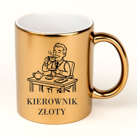 Modny, złoty kubek z nadrukiem „Kierownik Złoty”.
