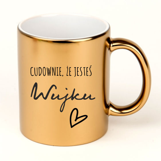 Modny, złoty kubek z nadrukiem „cudownie, że jesteś Wujku”.